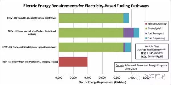 下面这张图更好的说明了氢氧燃料电池汽车消耗的能量比普通电动汽车更多。