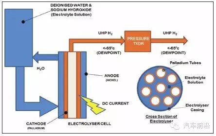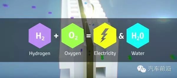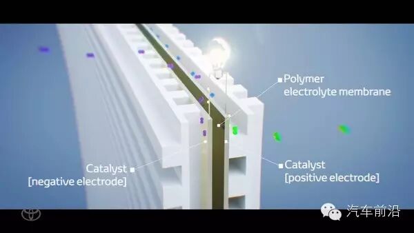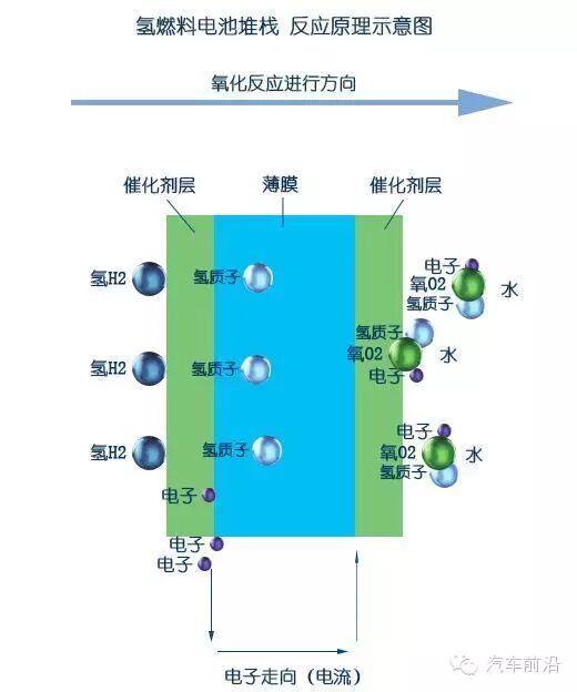 产生电力的过程:氢气经过含有催化剂层的质子交换膜,在这里氢气受压通过铂催化剂,分解成两个氢质子和两个电子,这些电子会驱动汽车的电动机,氢质子与氧在薄膜的另一端结合成水,以蒸汽“废气”的形式排出。随着氧化反应的进行,电子不断发生转移,就形成了驱动汽车所需的电流。其原理图如下。