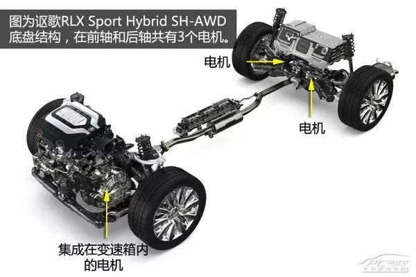 用于高端车型的,使用三颗电机的Sports Hybrid SH-AWD(Sports Hybrid-Super Handling-All WheelDrive,运动化混合动力超凡操控全轮驱动系统。这套系统的动力组成比较复杂,前轴的动力搭载与i-DCD相似,只是换了更大排量的电机和更高功率的电机,后轴上分布置了一组锂电池,左右轮分别由一组电机驱动。目前主要搭载在NSX和讴歌RLX Hybird 上。