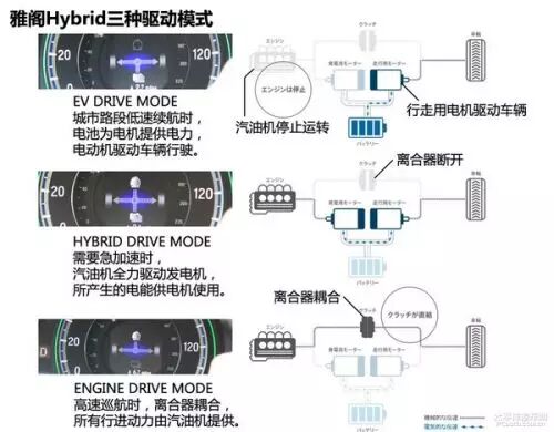 发动机驱动模式,在高速巡航时使用。这种模式下就跟普通汽车差不多了,发动机与E-CVT通过电离耦合,动力由发动机直接提供。虽然电池组处于待机状态,但如需进一步加速时可随时启动驱动电机转换为混合动力驱动模式。