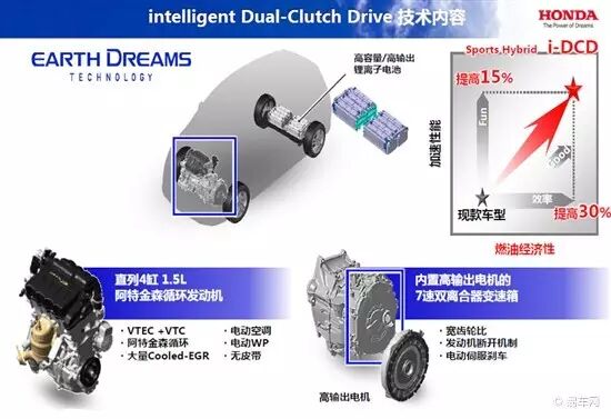 本田这三套系统可依据不同车型进行搭载。用于低端车型,使用一颗电机的i-DCD(Intelligent Dual Clutch Drive,智能双离合驱动)系统,动力系统是由1.5L阿特金森循环发动机和集成电动机的7挡双离合变速箱组成的,目前主要搭载在飞度的混动版。