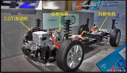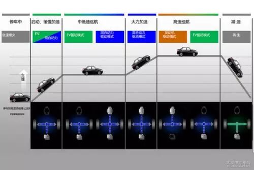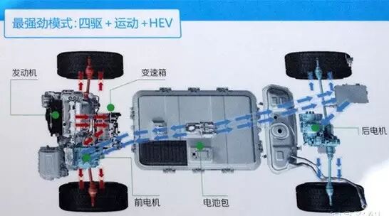 模式二:在急加速或者高负荷工况下,前后电机都启动,发动机也参与驱动,此时是这套系统的较强劲模式