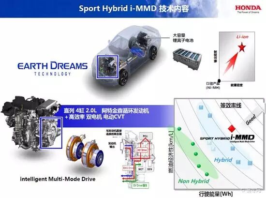 用于中端车型的,使用两颗电机的i-MMD(Intelligent Multi Mode Drive,智能化多模式驱动)系统,动力组成主要是2.0L阿特金森循环发动机、E-CVT(电耦合CVT与本田THS那套CVT完全不同)和两组电机组成,目前主要搭载在九代雅阁的混合动力车型上。