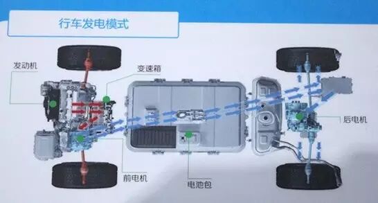 模式三:汽油机为电池充电,前桥电机充当发动机,电池输出电流驱动后电机运转来驱动车辆行驶。当然此时因为前桥电机和变速箱是啮合状态,所以前轮实际是被发动机驱动,这种模式是燃油消耗*高的状态。