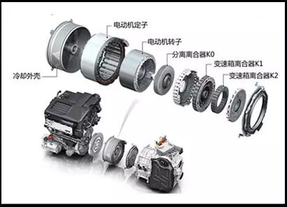 这里要重点解读一下这套电耦合CVT,可以简单理解为只有两个档位的自动变速器或者离合器。它的本质也是非常简单的齿轮机构,只有两个固定的齿轮传动比,**:2.45(电机驱动时) 0.803(内燃机驱动时) 第二:3.421。当汽车在起步或者低速模式下,使用那个较大的齿轮比,这时候与离合器分离与发动机固连的电机,只有电动机驱动汽车。而另一个组较小的减速比,也就是我们常说的超速档所用的齿轮比,适合高速巡航,这是离合器接合发动机,来驱动汽车高速行驶。当速度降低导致发动机扭矩输出不足时,PCU会让电动机跟进,整个过程的动力输出都像CVT波箱那样从低速到高速之间无缝连接。
