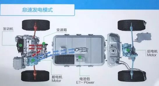 模式四:等红灯等怠速状态下,汽油机带动前桥电机为动力电池充电。