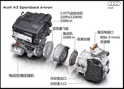 大众在15年先后推出了奥迪A3 e-Tron和Golf GTE两款混合动力车型。这两款车除了锂电池的容量和总功率稍有差别之外,搭载的动力以及控制逻辑基本相同。都是由大众的EA211 1.4TSI发动机,加一台电机(发电机与电动机一体集成)和一组锂电池组成,匹配的是一款名为e-S tronic的变速器。e-S tronic实际就是在目前大众第三代6速DSG变速箱的基础上又加了一个离合器,这个离合器是用来分离电动机和发动机的。 接下来我就以 A3 e-tron的动力结构图来解说大众这套混动系统。