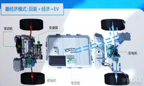 唐的控制逻辑其实也不复杂,四种模式在驾驶过程中由行车电脑进行智能切换。但是我们发现唐在满电(18.4kW·h)、满油(53L油箱)的状态下的实际续航里程只有500km左右(多家媒体实测,官方数据为700km,为啥差别这么大,在电动车的文章里我有详细解说过,感兴趣的读者可以去查阅)。这与常规燃油车相比并不具备多少优势。究其原因还是在于唐在搭载了这一套混动系统后,整备质量达到了2220kg,那套容量达18.4kW·h的磷酸铁锂电池组就重达200多千克。同时这套系统是偏向于性能,电机输出功率过大,导致整车的电量消耗过快。当动力电池的电被消耗完之后,发动机一边要驱动前桥,一边也要带动前桥电机给蓄电池充电来驱动后桥,这个过程燃油消耗比较高。
