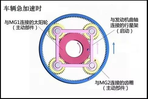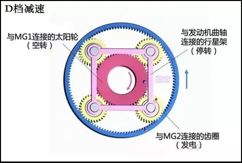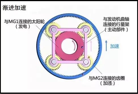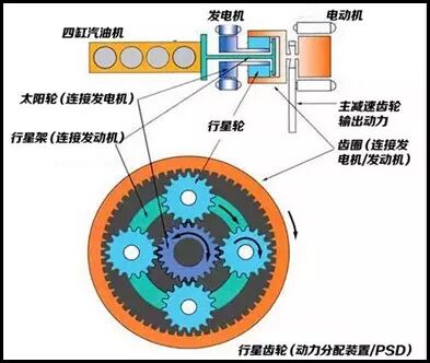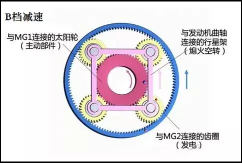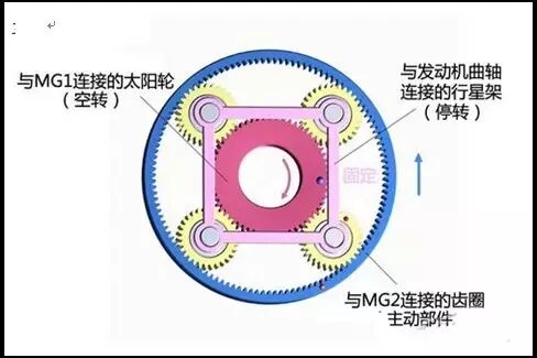 E-CVT带有两台电机(既能作为电动机,也能作为发电机)——MG1和MG2。MG1主要用于发电和调速启动发动机,MG2主要用于推动汽车。而MG1、MG2以及发动机输出轴被连接到一套行星齿轮机构的太阳轮、齿圈和行星架上。发动机输出轴与行星架相连,MG1电机与太阳轮相连,MG2与外圈齿轮相连,同时作为动力输出与减速器和差速器相连。动力分配就是通过功率控制单元控制MG1和MG2电机,通过行星齿轮机械机构进行巧妙分配。车辆行驶时,在不同工况下MG1电机相连的太阳轮在进行着正转和反转运动,而与MG2电机相连的外圈齿轮只有在发动机挂入倒挡是才会反转,与发动机相连的行星架只能处于静止或者正转状态。