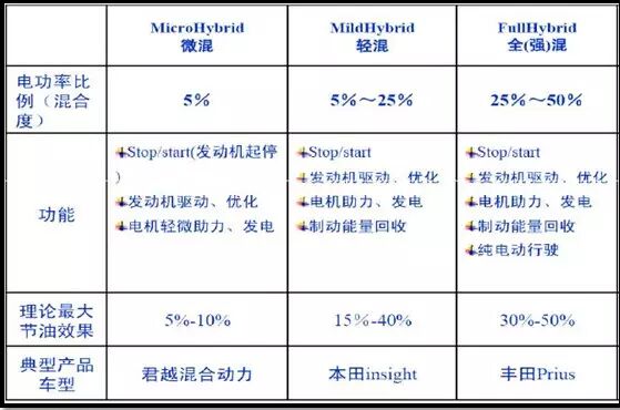 目前混合动力车型的类型比较多,按传动系构型可分为:串联式混合动力、并联式混合动力、混联式混合动力三种。根据混合度(即电功率比例)的高低可分为:轻混、中混、重混(强混)。按可不可以外接充电可划分为:一般混合动力(Hybrid)、充电式混合动力(Plug-In)。